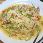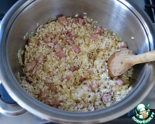Но когда я показала ему, что рис впитает в себя все соки от лука и бекона и лишь потом заливается водой (да, бульона у меня тоже не было), то стал бегать как кот вокруг сметаны, приговаривая "Это будет точно очень вкусно"