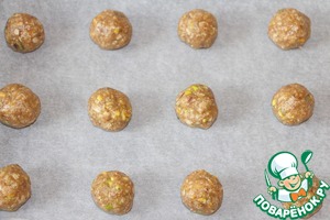 Скатать шарики размером с грецкий орех, выложить их на противень, застеленный бумагой для выпечки, на расстоянии 5 см друг от друга. -