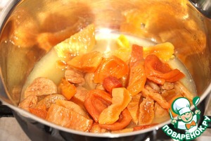 Для начинки промытую курагу залить апельсиновым соком в небольшой кастрюльке, довести до кипения и потомить на среднем огне 1 минуту. Огонь убрать, дать настояться 15 минут. Переложить в чашу блендера и измельчить до состояния пюре. Полностью остудить.