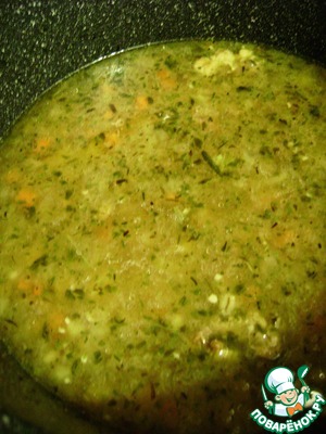 В мясной бульон опустить картофель, нарезанный кубиками вдвое крупнее овощей. Дать закипеть, затем опустить готовую крупу. Регулируйте густоту по своему вкусу, но похлебка не должна быть жидкой. Дать покипеть на медленном огне минут 10 и опустить овощную пассеровку. Снова дать прокипеть пару минут, попробовать на соль, положить лавровый лист и посыпать сушеной петрушкой. Убавить нагрев до минимума и потомить суп минут 10. Затем снять с огня и дать настояться под крышкой еще минут 10.