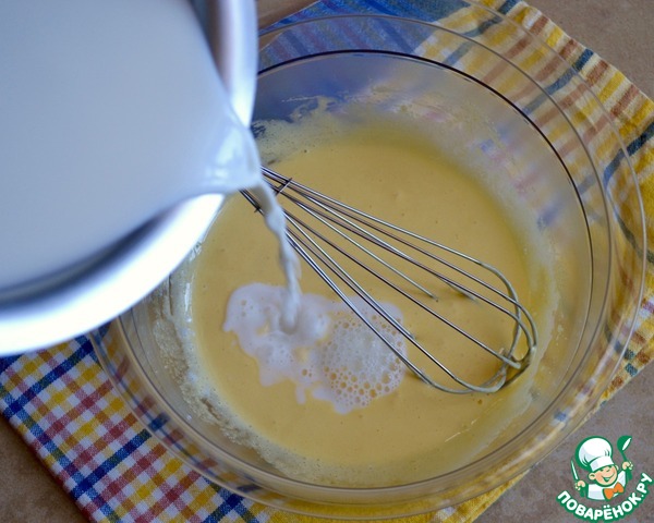 • Для крема поставить молоко нагреваться на огонь. Отдельно в миске растереть желтки с сахаром и ванилином, добавить столовую ложку крахмала и перемешать, чтобы не было комочков. Влить немного тёплого молока и размешать, чтобы яйца не свернулись.
