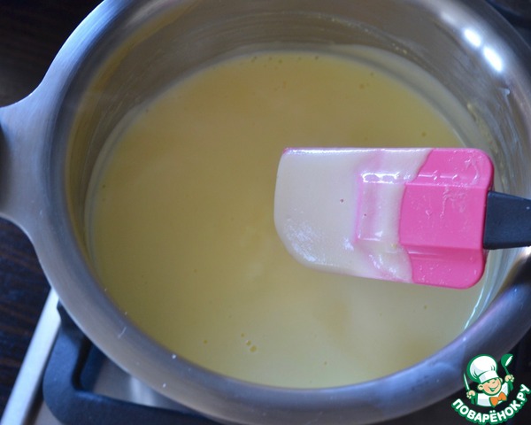 • Перелить весь крем в кастрюльку с оставшимся молоком и варить на среднем огне до готовности, постоянно помешивая! Крем не должен закипеть... Фактически, он должен достигнуть температуры около 82 градусов. Если у Вас нет кулинарного термометра, то просто ориентируйтесь по состоянию самого крема - он должен загустеть настолько, чтобы на силиконовой лопатке (ложке) оставалась слой крема (как на фото). Сразу снять крем с огня и полностью остудить.
