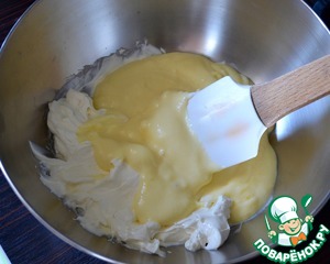• В миске размягчить маскарпоне, добавить к нему остывший крем и осторожно перемешать.