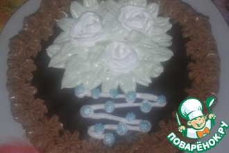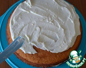 • Нижний корж пропитать сиропом и смазать половиной крема.
