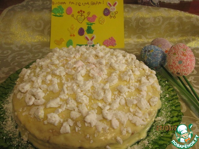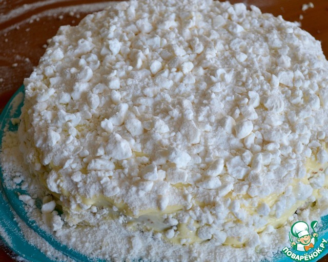 • Безе (меренги) поломать на маленькие кусочки и обсыпать ими весь торт. Убрать в холодильник минимум на 2 часа.