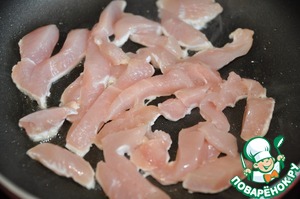 Куриное филе (в моём случае грудка) нарезаем тонкими полосками.