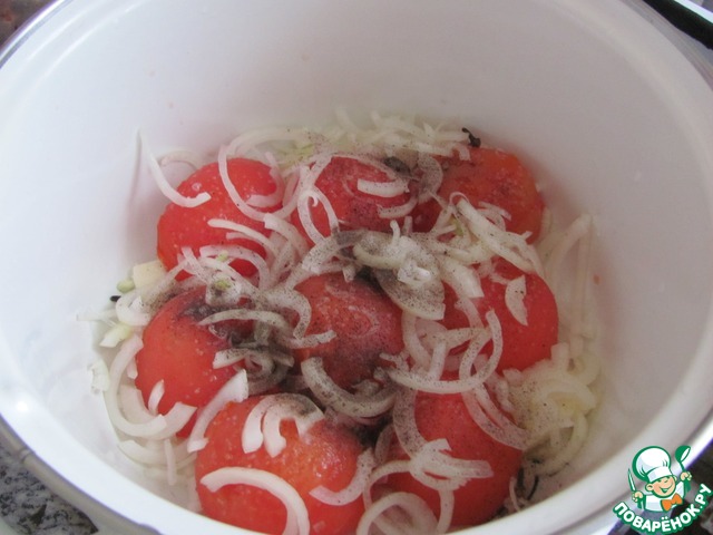 Штук двенадцать помидор избавьте от жопок, ошпарьте бедолаг кипятком, с живодёрским наслаждением сдерите с них кожу и разрежьте пополам. ))) Половину выложите плотным слоем на масло срезом вниз, присыпьте солью, нарезанной полукольцами луковицей, чёрным перчиком и гвоздикой.