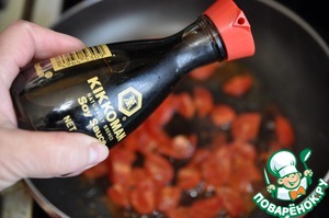 Добавляем гранатовый сироп и соевый соус "Киккоман". Перемешиваем.