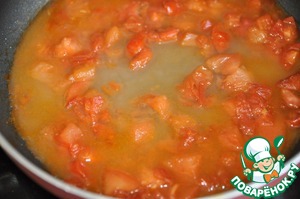 На сковороду наливаем растительное масло, кладём помидоры и обжариваем помешивая 5 минут. -