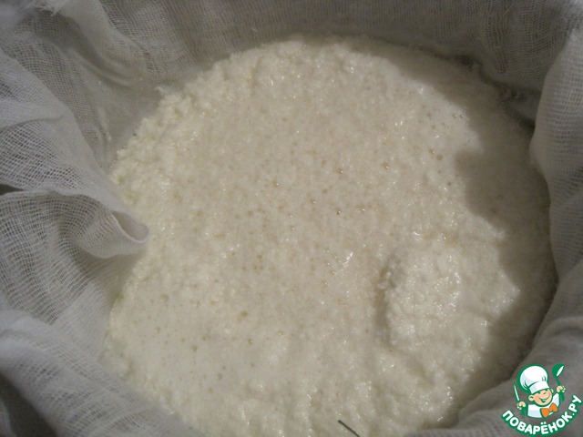 Выливаем на сито с двойной марлей для стекания лишней жидкости на пару минут.