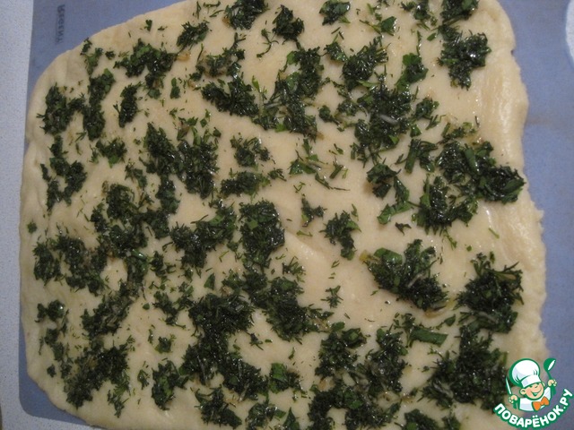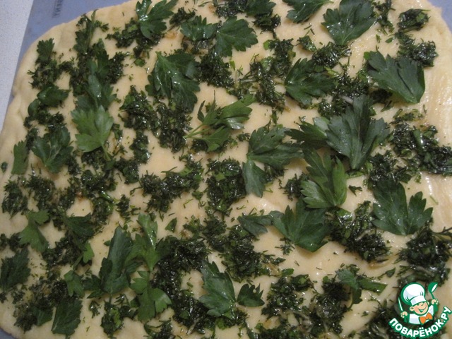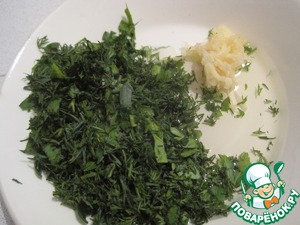 Готовим начинку. Зелень измельчаем, добавляем натертый на мелкой терке чеснок и растительное масло.