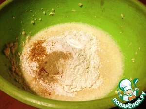 Добавить просеянную с разрыхлителем муку, соль, корицу, кардамон и апельсиновую цедру. Перемешать.