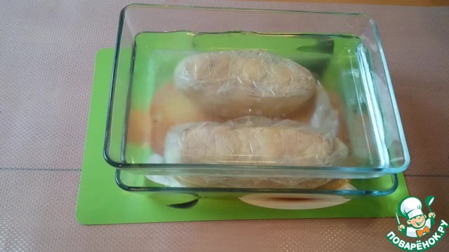 Перекладываем рулет в плоскую посуду и ставим небольшой гнёт. Убираем в прохладное место минимум на 8 часов.