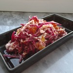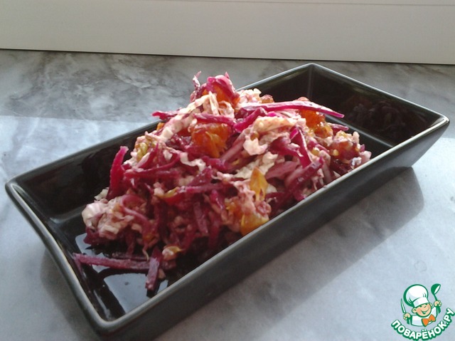 Мандарины очистить и нарезать небольшими дольками. Орехи прокатать скалкой, но чтобы не в "пыль", пусть будут не большие кусочки. Если требуется, добавить в салат соль, перец обязательно. Заправить салат подготовленным соусом, перемешать.