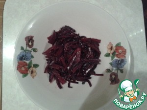 • Свеклу почистить, нарезать соломкой, обжарить до готовности (мягкости), остудить и выложить в салатник.