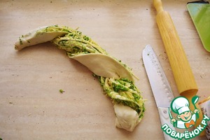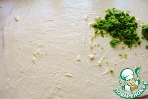Распределяем наш чеснок по раскатанному и смазанному маслом тесту, посыпаем рубленным укропом