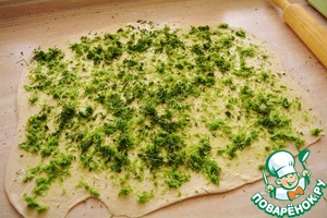 • Распределяем наш чеснок по раскатанному и смазанному маслом тесту, посыпаем рубленным укропом