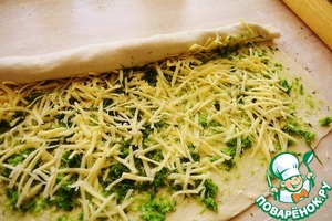 • Посыпаем тертым сыром, и скатываем в рулет как можно плотнее, туже.