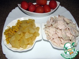 Кукурузу и ананасы процедить от жидкости, помидоры нарезать кружочками. У меня замороженные черри, я обдаю их горячей водой, даю пару минут постоять, а потом они отлично нарезаются.