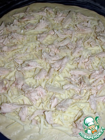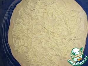 Сыр поделить на 2 части и посыпать 1 часть на тесто.