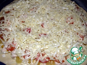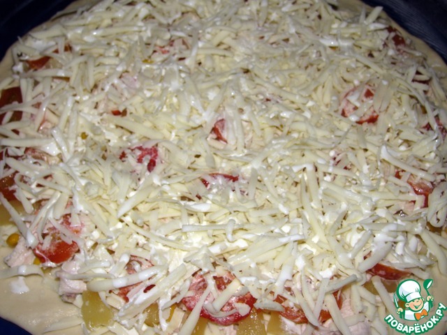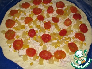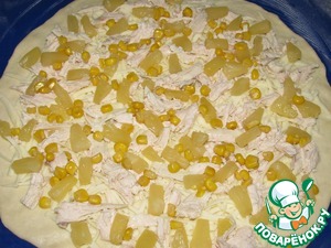 Рецепт выставляю только по просьбе сына, который давно уговаривает меня сделать это. Понимая, что пиццей с курицей и ананасами никого не удивишь, все же рискну поделиться своей версий. Из-за того, что мой сын обожает классическую пиццу с курицей и ананасами, еще я кукурузу добавляю (без нее мы жить не можем :)) мне захотелось разнообразить ее вкус, чтоб не так сладко было. Вот и придумала добавить помидоры и сливки. Вышло очень вкусно, помидоры с ананасами подружились, а сливки с тающим сыром соединились в божественный соус!