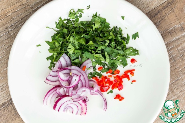 Лук тонко нашинковать, зелень и и перец чили мелко порубить.