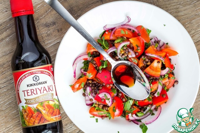 Вкусный, легкий и в то же время сытный салат. То, что нужно для нашей солнечной, но пока ещё прохладной весны! Болгарский перчик придает блюду легкую сладость, помидоры - свежесть, чили и лук - остроту. Чечевица и жареный сыр делают его питательней, а соус "Терияки" обогатит вкус и сбалансирует всё блюдо!
