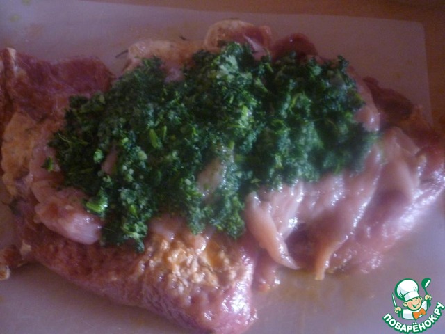 А я, честно говоря, два раза перечитала и всё равно смысла не нахожу... Я всегда считала, что кусок мяса разрезать книжкой, это на куски , соединенные с одной стороны, между которыми можно класть что угодно. В рецепте свинину, нарезанную книжкой вынимают из маринада и сверху кладут филе... Куда сверху??? И как выходит рулет?