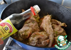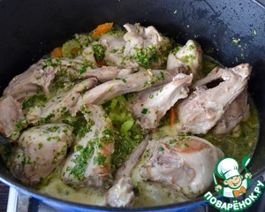 Выложить в кастрюлю песто и продолжить готовить кролика еще 40-45 минут на слабом огне. Время от времени переворачивайте куски мяса и, если соус будет испаряться, добавить еще немного вина или бульона (совсем немного, по вкусу).