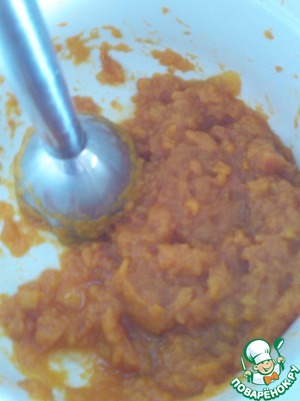 • Для начинки тыкву режем кубиками и отвариваем 10 минут. Сливаем воду и пюрируем блендером.
