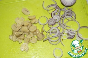 Грибы нарезать тонкими пластинами, лук порезать тонкими кольцами.