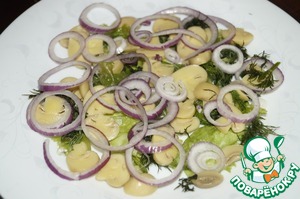 На дно чаши выложить листья салата или зелень укропа, затем грибы и кольца лука.