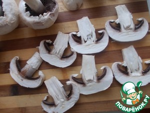 • Шампиньоны порезать пластинками и обжарить слегка на масле.