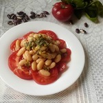 • Выкладываем помидоры порезанные полукольцами на тарелку, в серединку грибы и фасоль, поливаем заправкой из чеснока и украшаем зеленью. Подаем к столу. Уже тот кто кушает, сам перемешивает красоту на тарелке. Приятного аппетита!