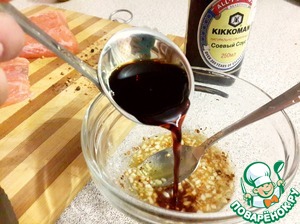 - Соевый соус (ТМ Киккоман; 2 ст.л. для рыбы и 4 ч.л. для соуса) — 4 ст. л.