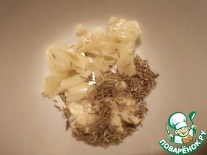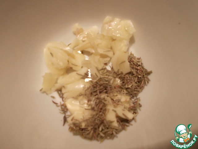 Растираем ножом на доске чеснок, вернее раздавливаем. Можно воспользоватся чеснокодавилкой. Смешиваем с тимьяном, солью, горчицей и маслом.