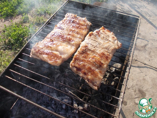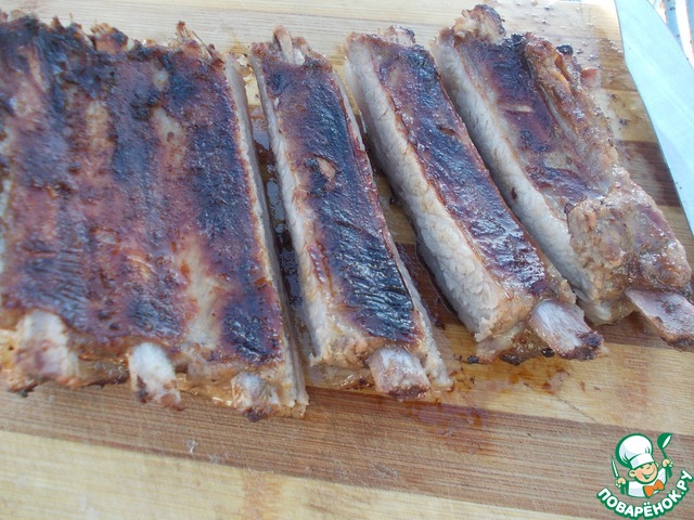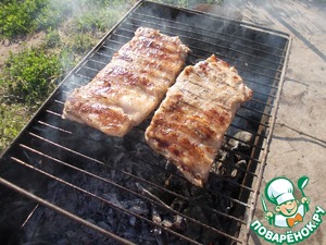 Разжигаем мангал. Когда угли посереют, начинаем жарить ребра. Постоянно переворачиваем и смазываем остатками маринада. Проверить в конце на готовность, просто проткните вдоль ребра ножом мясо, если сок прозрачный, значит мясо готово, если с кровью, жарьте дальше.