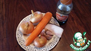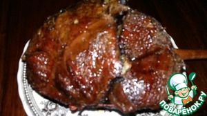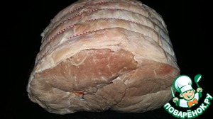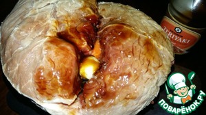 На следующий день нашпиговать мясо чесноком, морковью и салом /у меня копченое/ и при помощи ниток, или сетки придать желаемую форму. Разрез для шпигования тщательно обмазать внутри соусом "Терияки" от Киккоман.