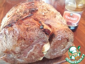 Готовое мясо со всех сторон силиконовой кисточкой обмазать соусом "Терияки", выложить на противень и запечь в максимально разогретой духовке около 10 минут, до образования румяной корочки. Соус придал мясу неповторимый вкус, аромат и очень красивый глянец.