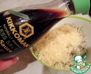 Добавить мелко нарезанный сыр, 1 ст. л. соевого соуса ТМ «Киккоман», перемешать.