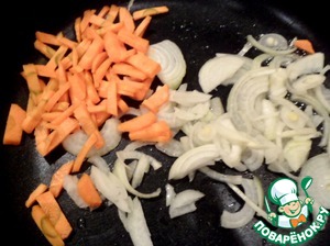 Лук нарезать полукольцами, морковь- соломкой, обжарить на растительном масле.