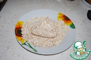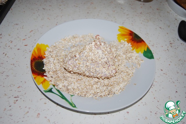 Предварительно маринуем курицу. Я использую приправу на основе карри, соль, немного майонеза. На тарелку насыпаем овсяные хлопья.
