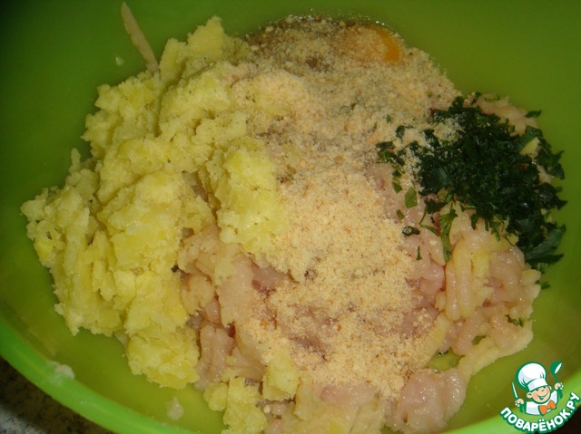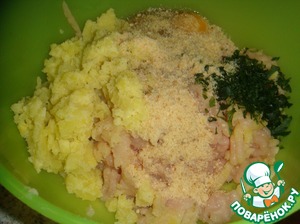 Измельчить петрушку. Куриное филе прокрутить на мясорубке со средней решеткой. Смешать куриный фарш, яйца, панировочные сухари, соль, перец черный молотый, петрушку и картофель.
