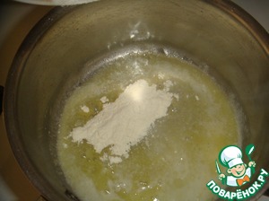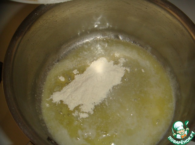 В масло добавляем муку и хорошо перемешиваем венчиком чтобы не было комочков.