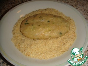 Достаем фарш из холодильника. Формируем из фарша котлетки и обваливаем их в панировочных сухарях.