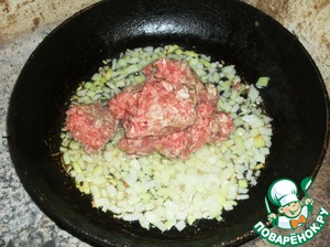 • Минут через 5 к луку и моркови кладем фарш. Сразу же добавляем перец. Перемешиваем.