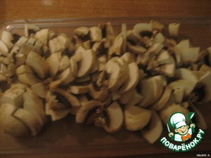 cмешиваем все ингрeдиенты - измельчаем лук, шампиньоны, вино, майонез, приправы.