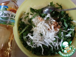 Салат разделить пополам, в первую часть добавить соль и растительное масло.