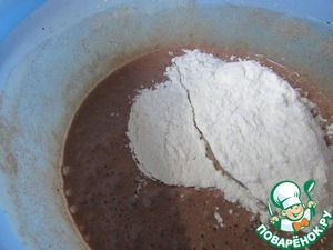 • Затем добавить пшеничную муку, просеянную с содой. Всё аккуратно перемешать.