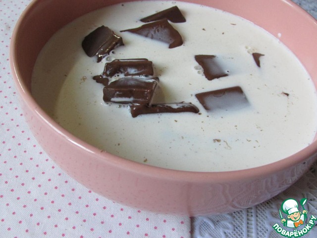 • Приготовить начинку. Шоколад наломать на мелкие кусочки. Залить горячими сливками. Растворить в них шоколад. Масса будет жидкой. Остудить её на столе, затем отправить в холодильник. Пока готовится пирог, масса в холодильнике станет погуще, как хорошая сметана.